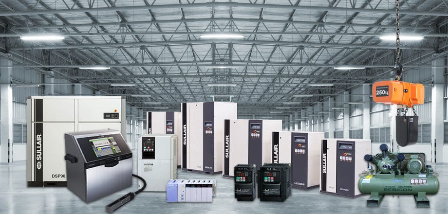 Our divisions are fully integrated, from sales to maintenance, service, research and development and manufacturing. Known for high performance, durability and reliability, Hitachi has a wide range of sophisticated and high-quality industrial equipment for businesses of all sizes including air compressors, chain hoists, ink-jet printers, as well as inverter and programmable logic controllers.