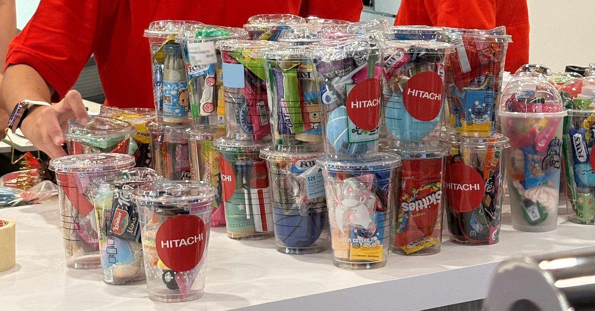 Over 2 months, our staff across 13 Hitachi Group Companies in Singapore donated recycled cups as well as small gifts such as stationery, mini toys, stickers and snacks. During the workshop, they also worked together to build, decorate and pack three handmade Christmas trees from simple, reused materials.