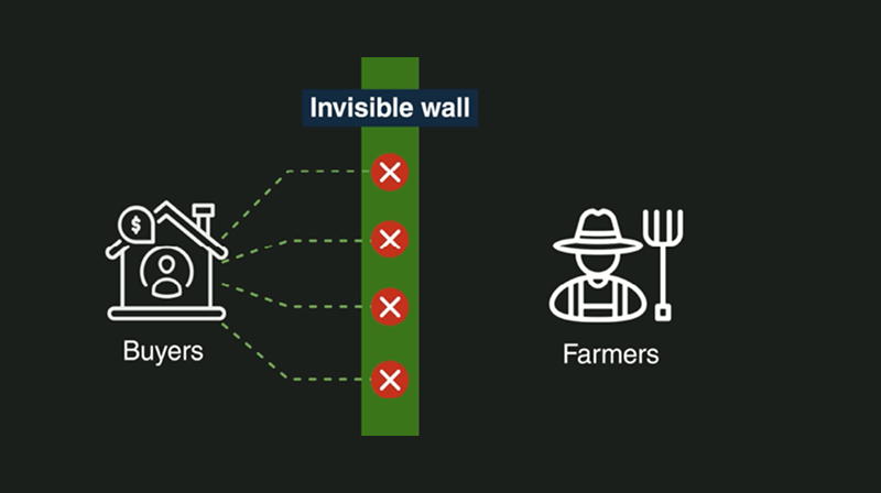 There are three nodes on the agricultural supply chain: buyers, cooperatives and farmers. Buyers cannot reach out to the farmers directly. They have to go through a cooperative to buy produce.