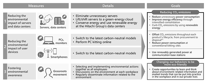 We will investigate the IT devices used by BUs#2 and Group companies and provide solutions that support the switch to environmentally-friendly IT services. This will accelerate efforts to reduce the environmental impact of the Hitachi Group as a whole.