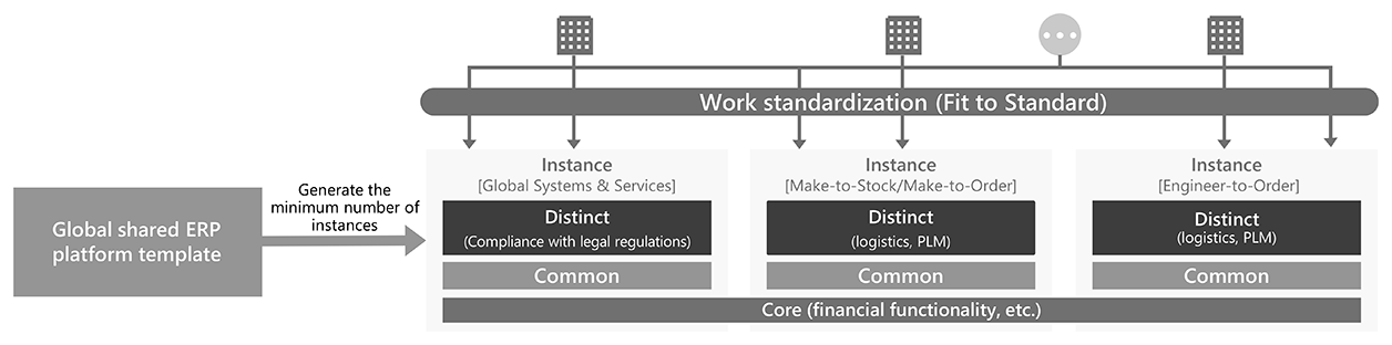 The shared ERP platform will increase the ratio of Core areas#3 and Common areas#4 while also appropriately allocating Distinct areas#5 that support business competitiveness. In addition, we will build the minimum ERP instances necessary for each business model and carry out efficient migration and implementation using the Fit to Standard methodology.