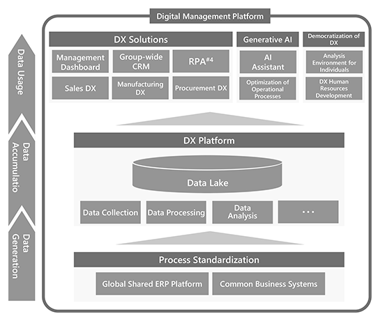 Furthermore, by accumulating the aggregated data in the DX platform and utilizing DX solutions, we will improve not only management decision-making but also the quality and speed of operations such as sales, manufacturing, and procurement.