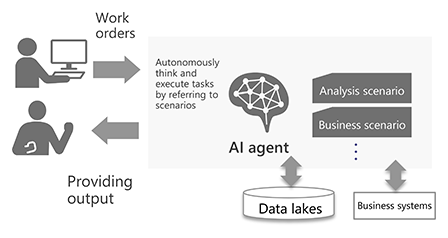 Developed countries are facing a decline in their working-age populations, making it an urgent matter to improve productivity by utilizing digital technologies such as generative AI and RPA. Against this backdrop, Hitachi has set a goal of simultaneously improving front-line productivity and reducing the burden on workers. To promote sustainable growth, Hitachi Group is advancing efforts to improve efficiency of business processes for its employees through generative AI. By utilizing AI agents, which are the core technology of generative AI, to achieve integration with existing business systems, specialized AI for business operations, various data lakes, and office environments, we aim to automate and accelerate business processes to produce greater results.
