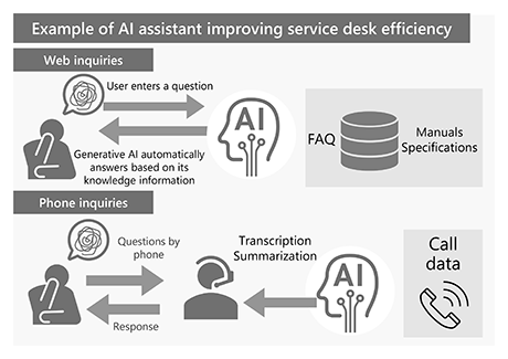 At the employee service desk, we aim to improve employee satisfaction and operator efficiency by utilizing generative AI. We are achieving an increase in self-resolution rates by having generative AI refer to FAQs, specifications, and manuals to present optimal answers to employees.