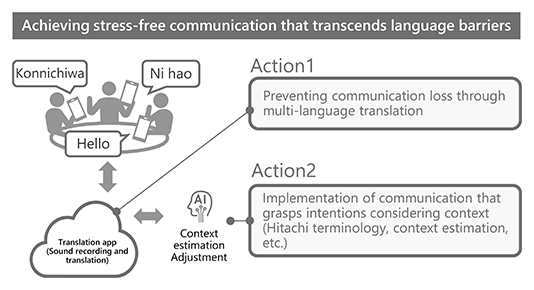 We aim to facilitate communication within the Hitachi Group and with external parties, and to build highly productive collaborative relationships with global members both inside and outside the company. By leveraging new technologies and gadgets such as AI-powered translation apps and earphones with automatic simultaneous interpretation functions to remove language barriers, we will achieve stress-free communication that transcends differences in languages and cultures.
