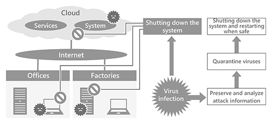 To address cyberattacks, we are implementing robust security measures by transitioning to an architecture based on zero-trust security. In anticipation of cyberattacks such as ransomware, targeted email attacks, worm-type viruses, and unauthorized access to servers open to the public, we have prepared response methods, from initial action to recovery, that are tailored to each type of attack. For example, these methods include isolating infected systems by shutting down the systems and suppressing the startup of applications, preserving and analyzing attack information, quarantining viruses, and shutting down the systems and restarting them when safe. We are working hard to ensure safe system operation and rapid recovery.