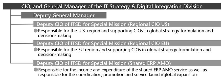 To strengthen global strategy formulation and decision-making, we have established a “Deputy CIO of ITSD for Special Mission” for each role, with three leaders participating. (As of August 2025, “Regional CIO US” is vacant.)