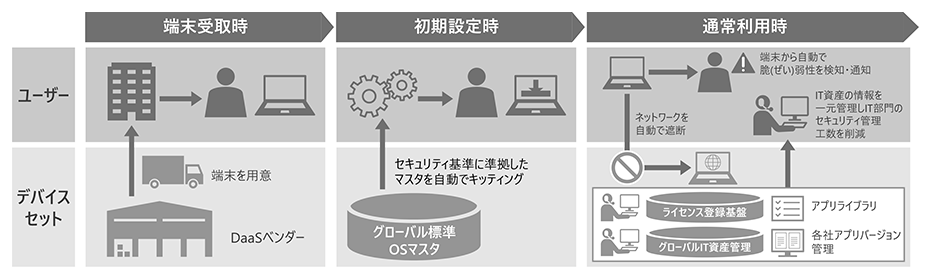 端末調達やキッティング自動化、ネットワークへの接続制限機能などを有するデバイスセットの開発により、日立グループのセキュリティ基準に準拠した端末・ソフトウェアをグローバルで展開し、さらなるセキュリティ強化を図ります。