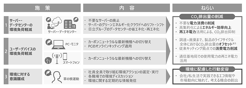 BU※2/グループ会社が利用するIT機器を調査したうえで、環境に配慮したITサービスへの切り替えをサポートするソリューションを提供しています。これによって、日立グループ全体の環境負荷低減を加速化します。