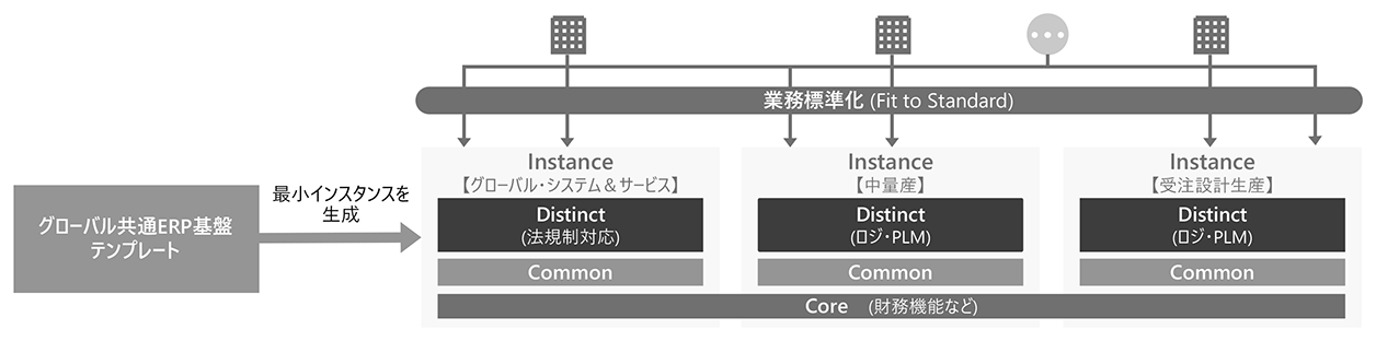 共通ERP基盤は、Core領域※3とCommon領域※4の比率を高めつつ、事業競争力を下支えするDistinct領域※5を適切な配分で併せ持ちます。また、事業モデルごとに必要最小限のERPインスタンスを構築し、「Fit to Standard」手法による効率的な移行・導入を行います。