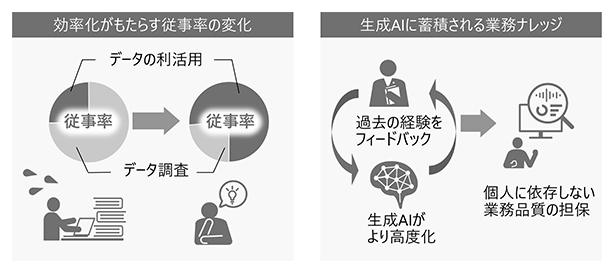 また、これまで個人のスキルに依存していた業務ノウハウを、生成AIやデータレイクに継続的に蓄積・フィードバックしていくことで、誰がおこなっても一定水準の業務品質を確保することが期待できます。