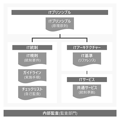 社内ITのリスク低減を目的として、情報セキュリティ、ITコンプライアンス、事業継続性を確保するためにIT規則・基準として、BU※1/グループ会社向けの「IT統制」の要件や「ITアーキテクチャー」を制定しています。