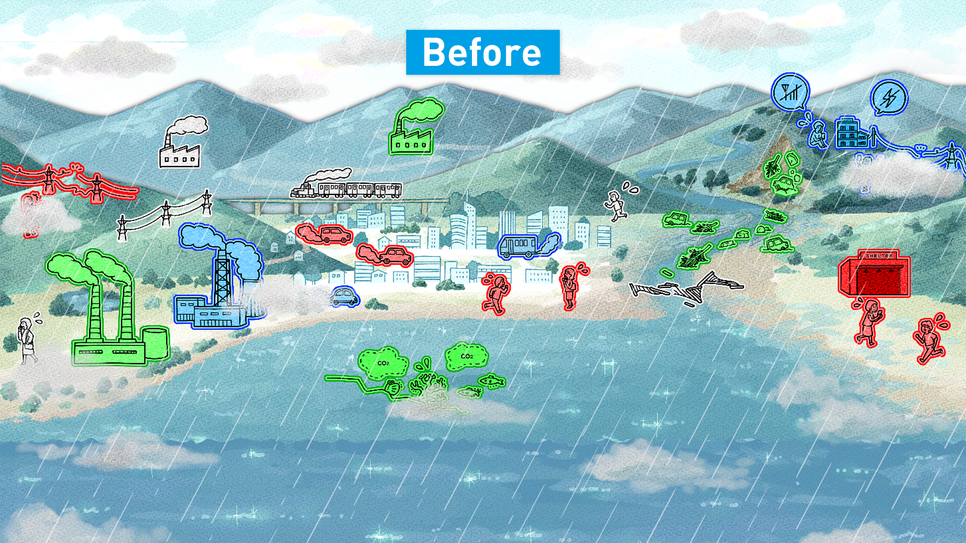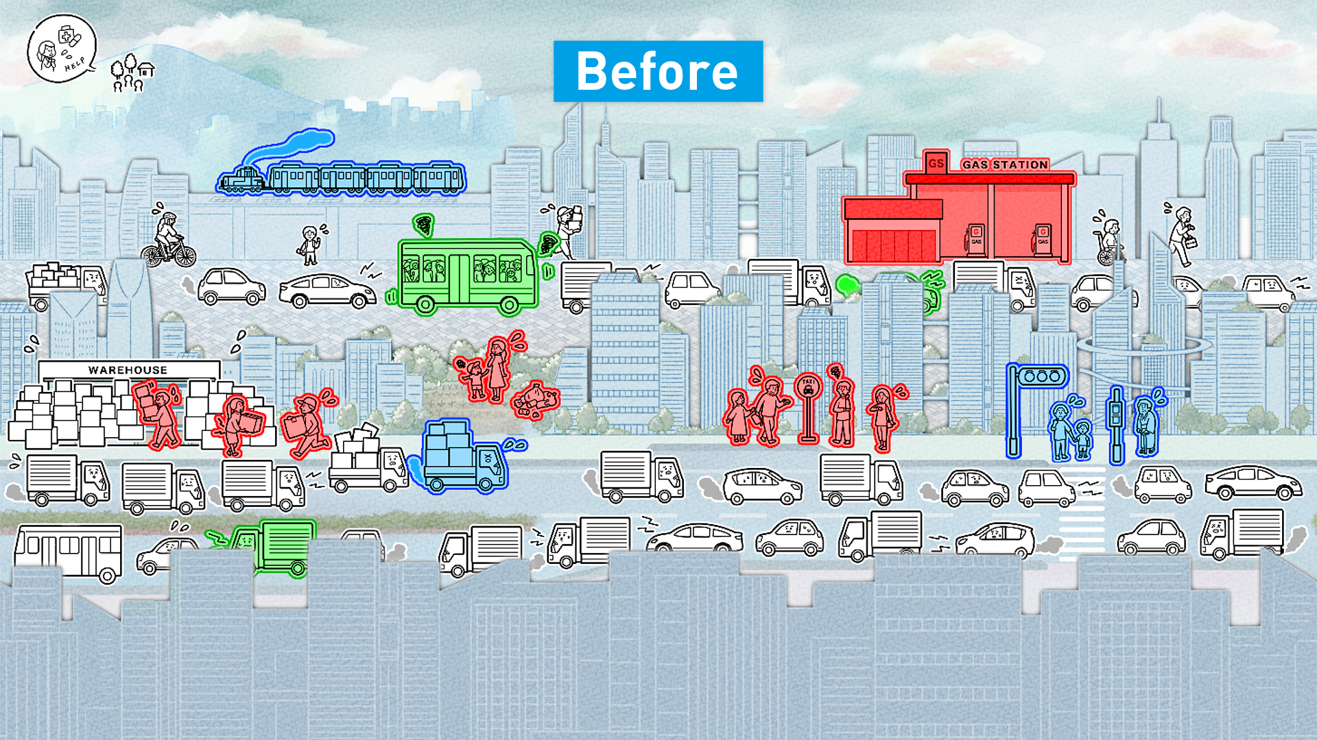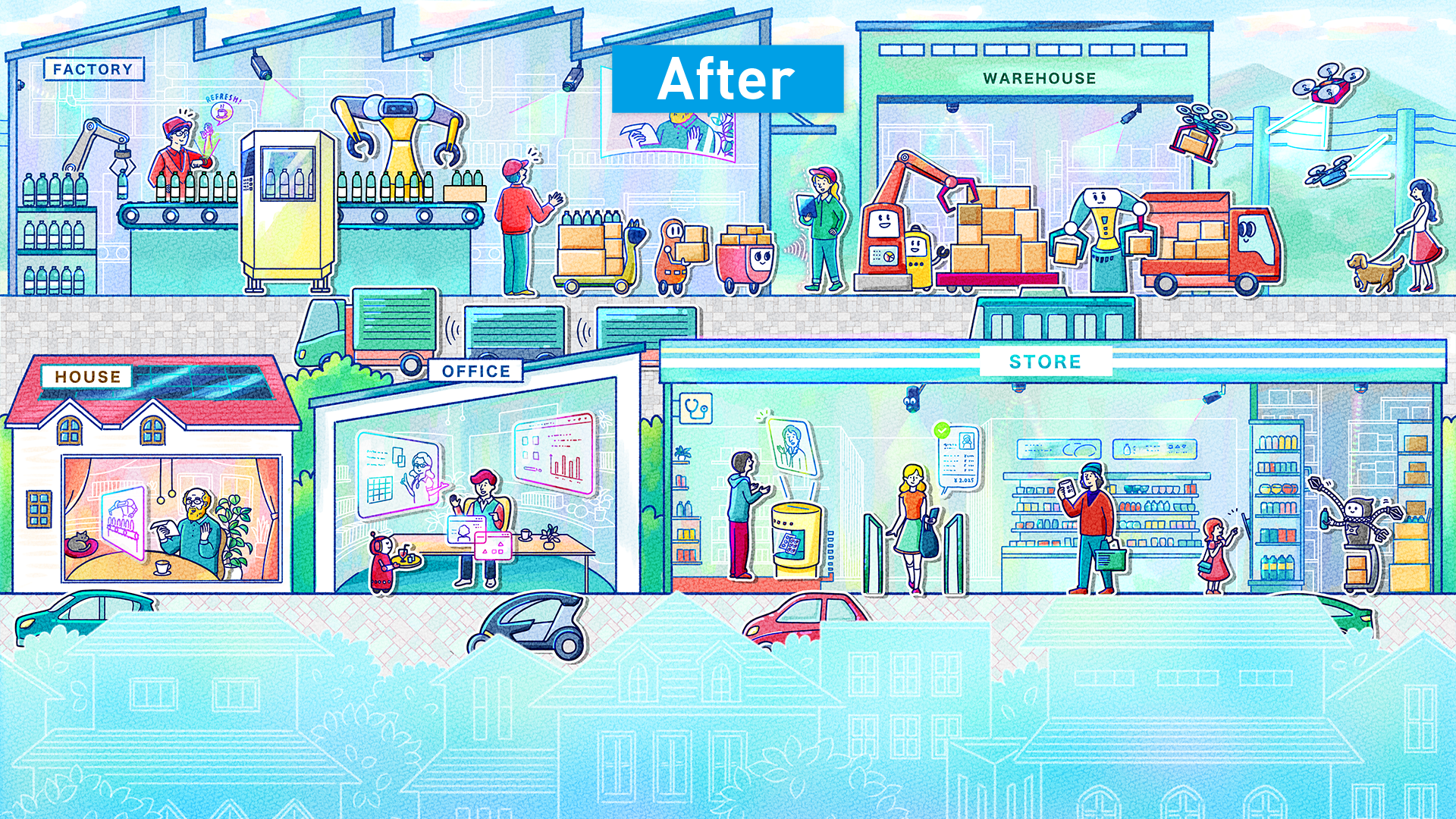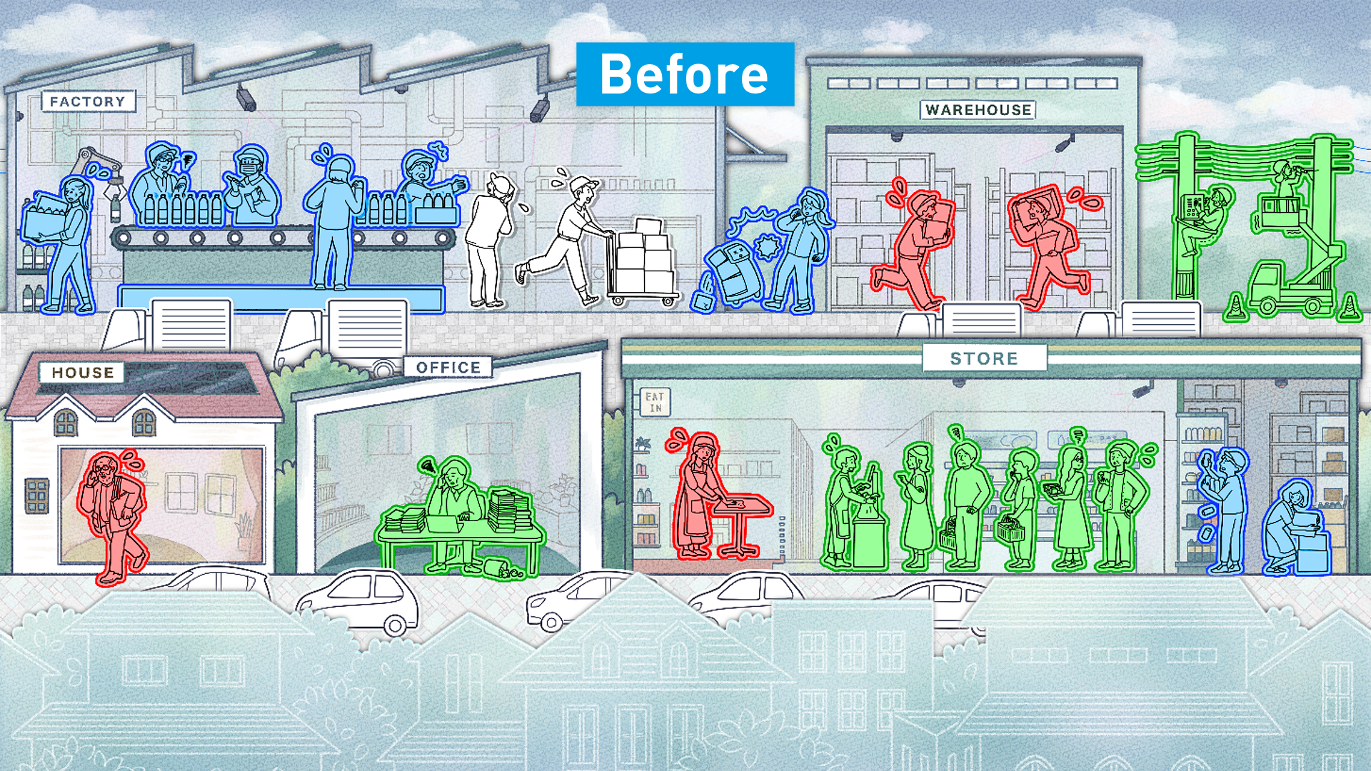 お店・工場・街の3つのステージを舞台に、薄い色で表現されている「困りごと」を塗り替えて、 未来の姿をつくっていきます。 - あそびかた
