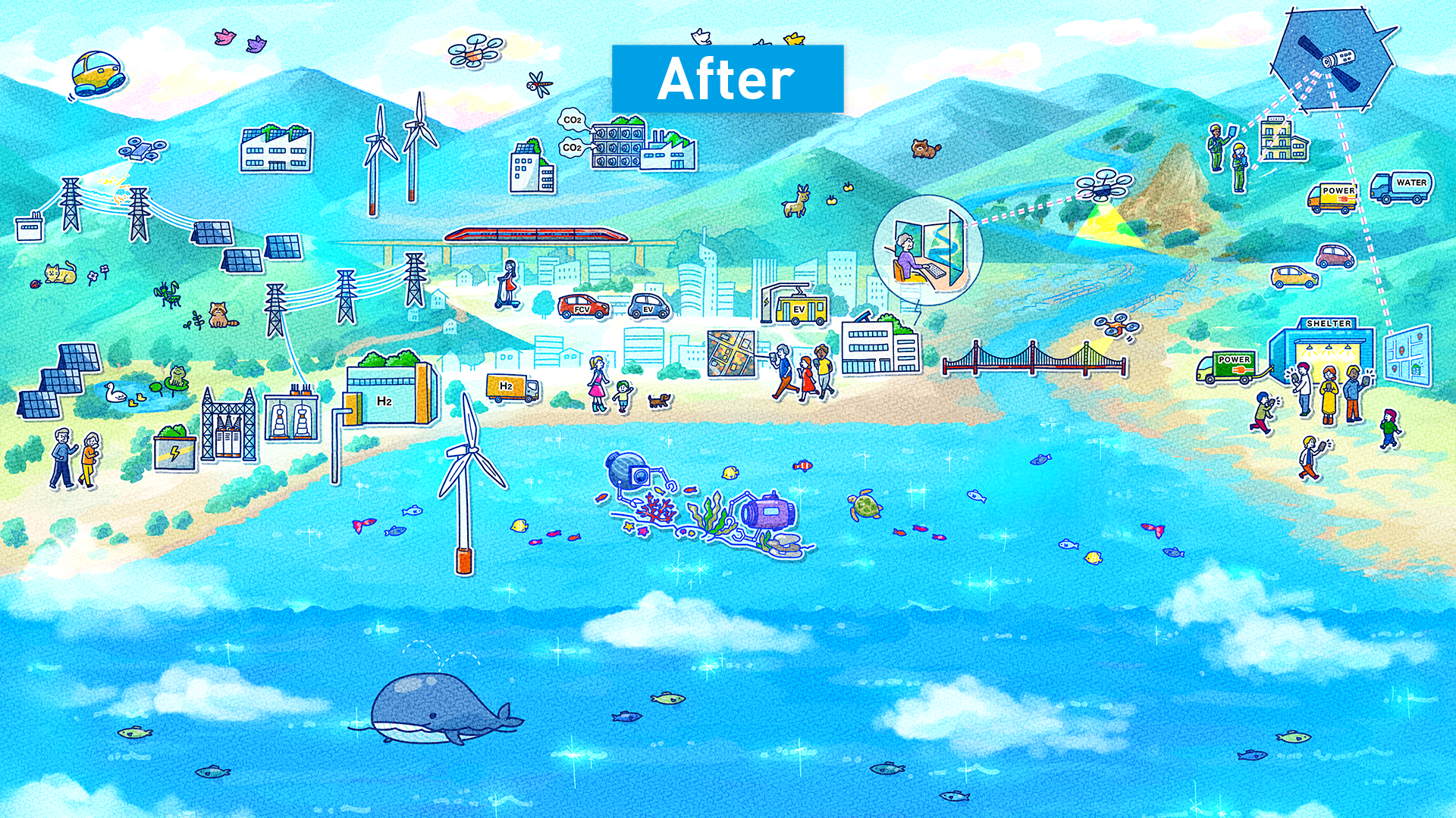 気候変動や都市の混雑など、画面に次々と現れる社会課題に向けてタッチパネル上の「ミライボール」を投げると、世界が明るく快適な未来へと変化するゲームコンテンツです。