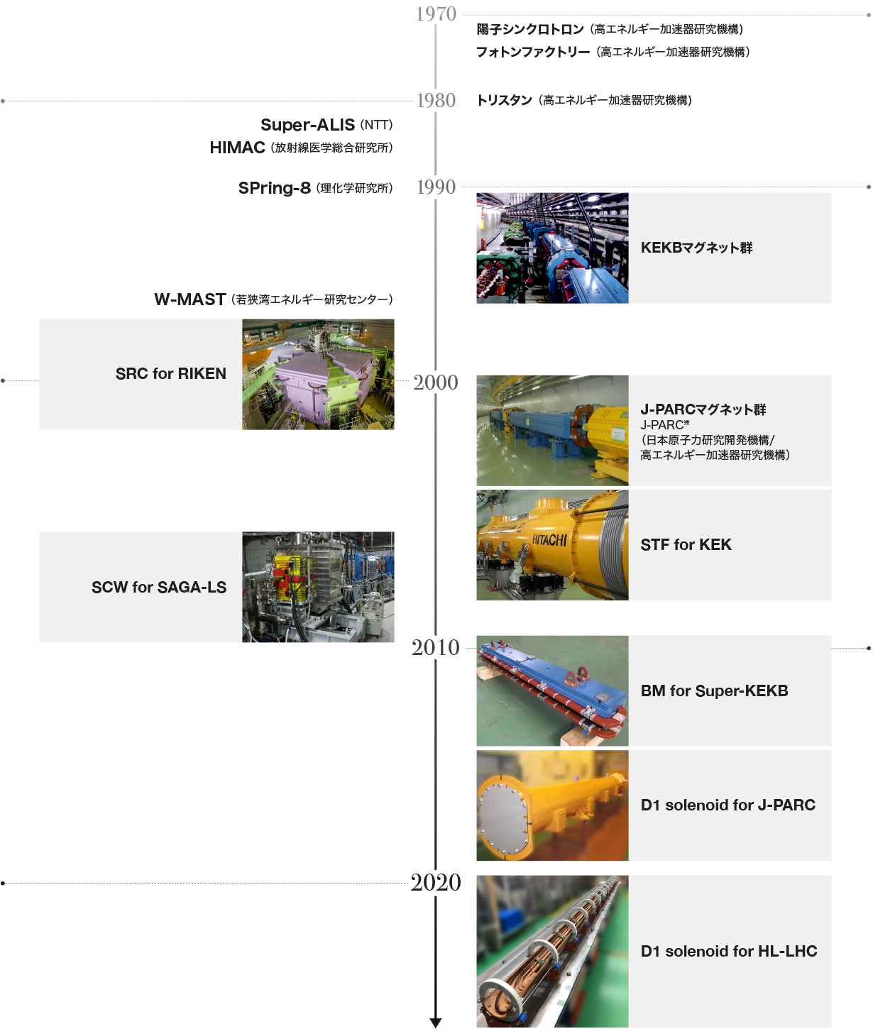 当社は大強度陽子加速器施設(J-PARC)向けに大型で高精度な実験装置用電磁石群を納入し、21世紀を代表する科学・研究活動(物質科学、生命科学、原子核・素粒子研究、核変換技術研究)に貢献しています。