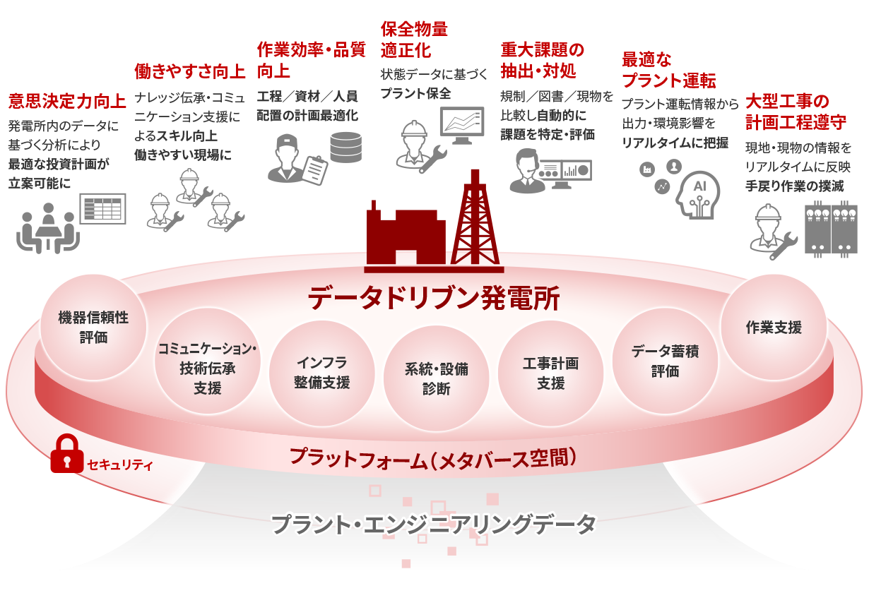 そこで、当社は、メタバースとAIを活用したプラットフォームをベースに、データに基づく最適な投資計画立案やプラント保全などを実現する“データドリブン発電所”の構築することで、お客さまが抱えるさまざまなニーズや課題に対して、データを活用した価値提供・課題解決を行うことをめざします。