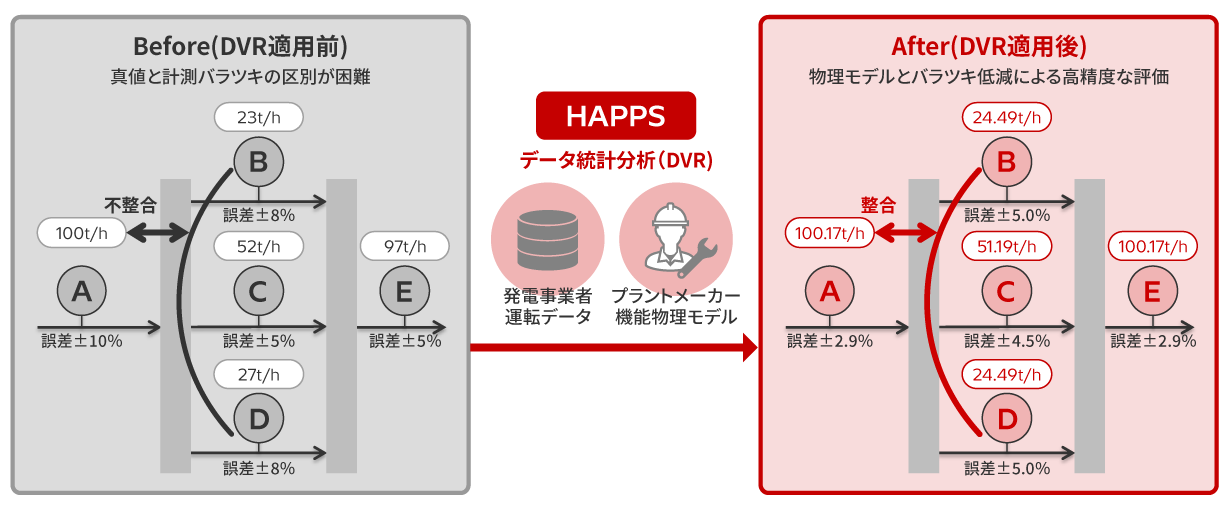当社が開発した日立先進プラント性能監視システムHAPPS(Hitachi Advanced Plant Performance Diagnosis System)は、データ統計分析法(DVR*)を用いてプラントの「最も確からしい状態」を把握し、常時閉止弁からの蒸気リーク検知、熱出力計算の高精度化、計器校正周期の延伸、校正物量の低減のほか、熱交換器やポンプなどの主要機器の保全タイミングの延長・最適化を実現し、原子力発電所の稼働率向上や保全適正化、発電効率向上に貢献します。