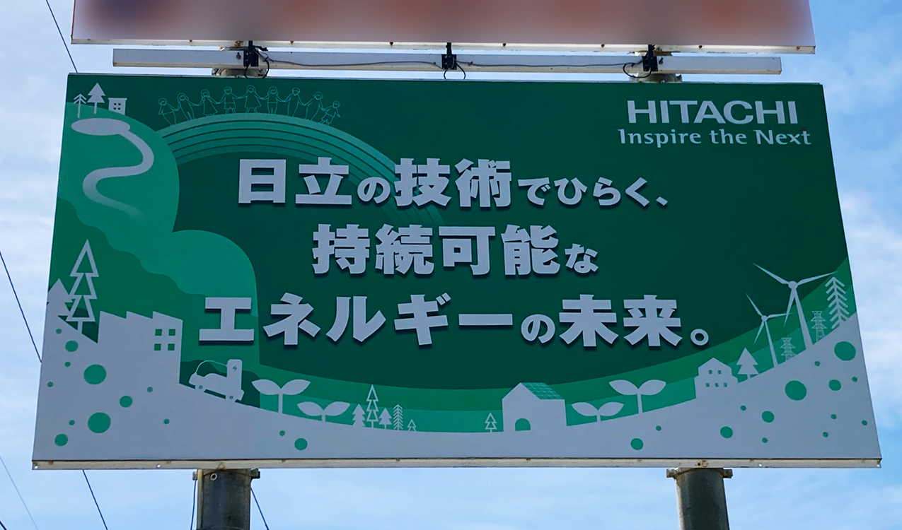 グリーンを基調色としたグラフィック「日立の技術でひらく、持続可能なエネルギーの未来。」を使ったロードサインを、日立市内国道沿い8か所に掲示しています。