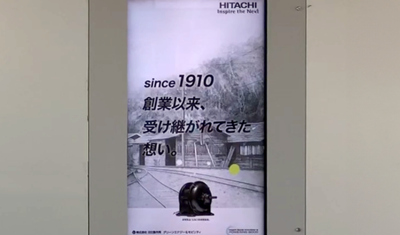 1910年の創業から、未来に向かって社会に貢献するというメッセージを込めた映像を、JR日立駅構内のデジタルサイネージで放映しています。