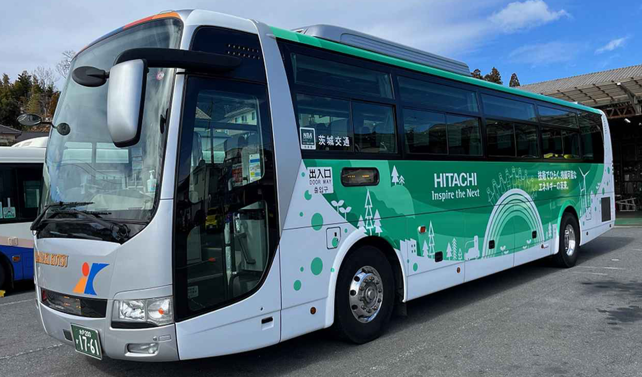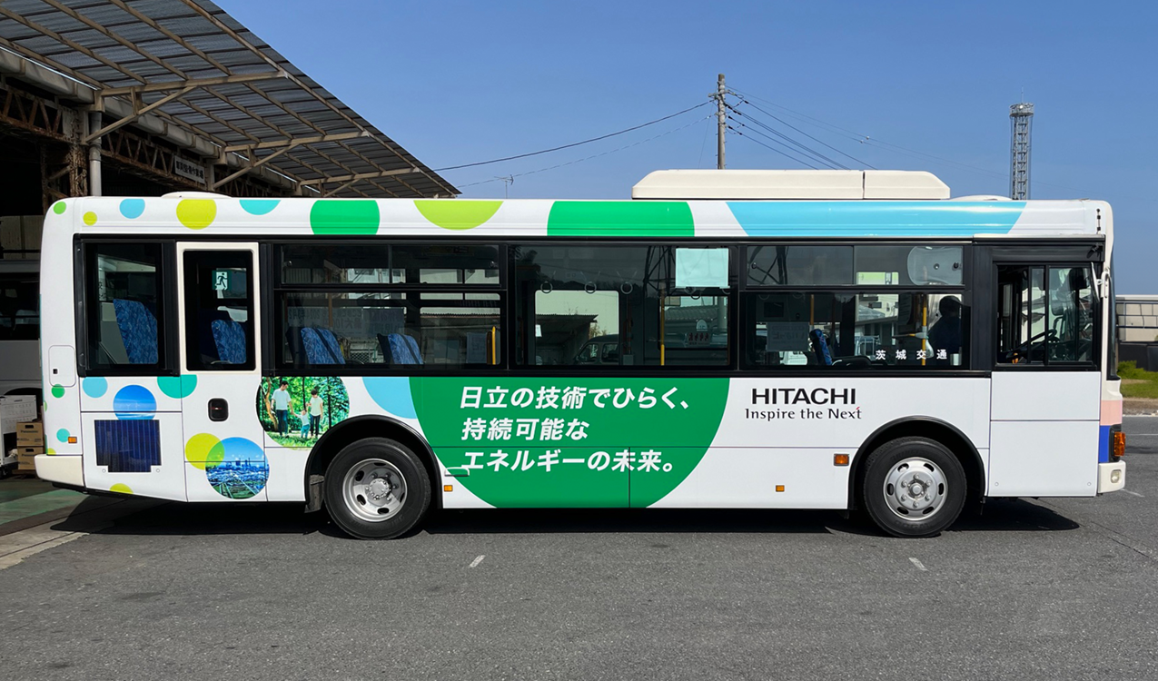 当社の創業者 小平浪平生誕150周年を記念し、創業製品である「5馬力誘導伝導機」のグラフィックと「日立の技術でひらく、持続可能なエネルギーの未来。」のメッセージを掲示した4台の路線バスが日立市内を運行しています。