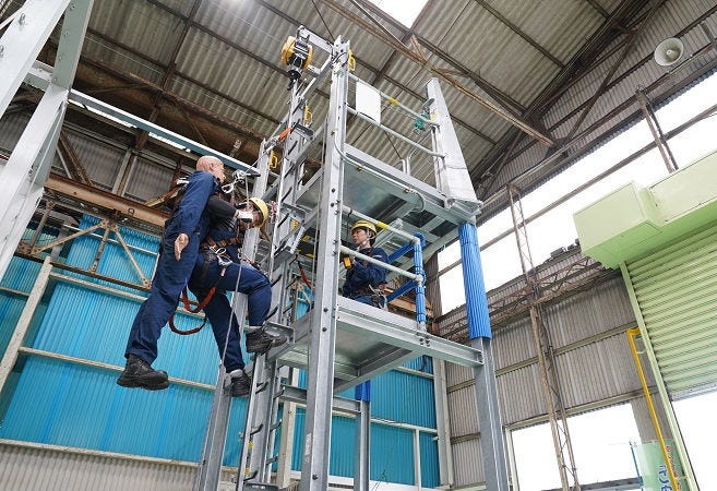 サービスエンジニア教育内容は技術研修だけでなく、レスキュー訓練であったり、労働災害の防止となるヒヤリハットの共有も行うなど多岐にわたっています。例えばレスキュー訓練では、同僚がハーネスによって空中に吊られた状態になった時の救出を、8分で完了できるようになるまで訓練します。なぜ8分かと言うと、人は空中で吊り下げられた状態が続くと、10分ほどで心肺停止になってしまうからです。救急隊の到着を待っている余裕はないため、いかに早く救出作業をするか、徹底的に訓練します。