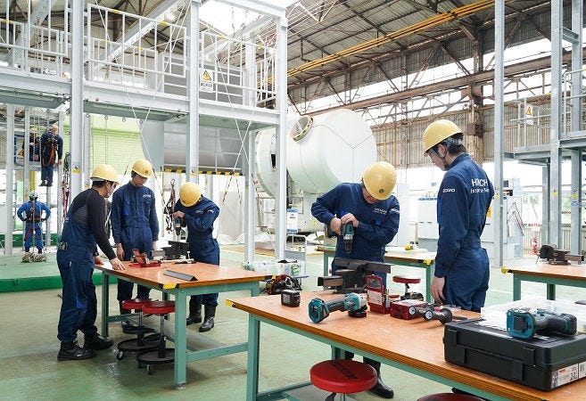 日立パワーソリューションズのサービスエンジニアは、日立トレーニングセンタと能代トレーニングセンタで座学や基礎訓練を受けてから各サービスセンタに配属されます。日立トレーニングセンタには風力発電の実機があり、ここで初めて実際の設備に触れます。また、配属後の現場の作業は先輩と2人で行うのが原則で、OJT(職場での実地教育)が基本となります。