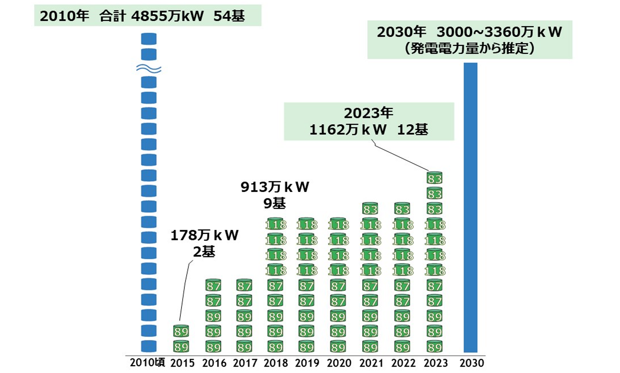 稼働中の原子力発電所の設備容量 出典:資源エネルギー庁の資料 第6次エネルギー基本計画より作成 推定容量は原子力の設備利用率70%と仮定