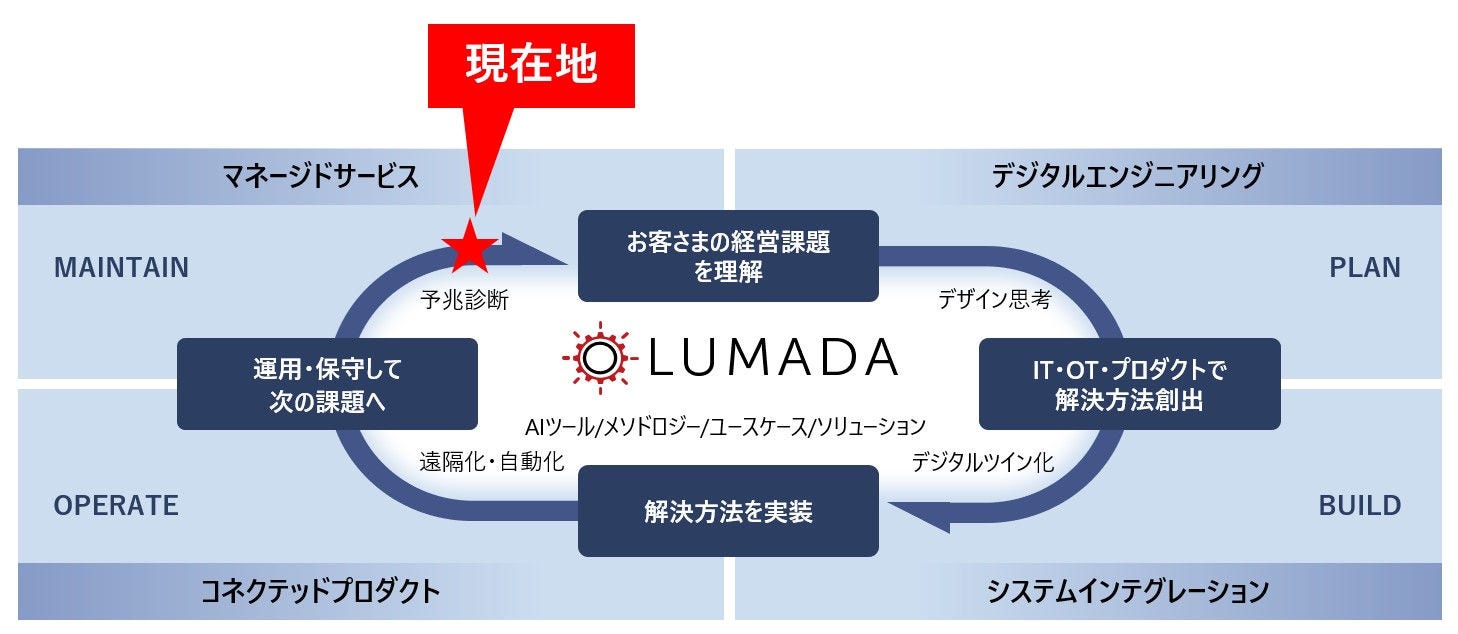 日立は、最新のデジタル技術を活用したソリューションやサービス、テクノロジーにより、企業や社会のDXを加速させるLumada事業に注力しており、その事業をお客さまとの協創サイクルと連動した形で4つに区分しています。「設備保全統合プラットフォーム」はそのなかのマネージドサービスにあたります。