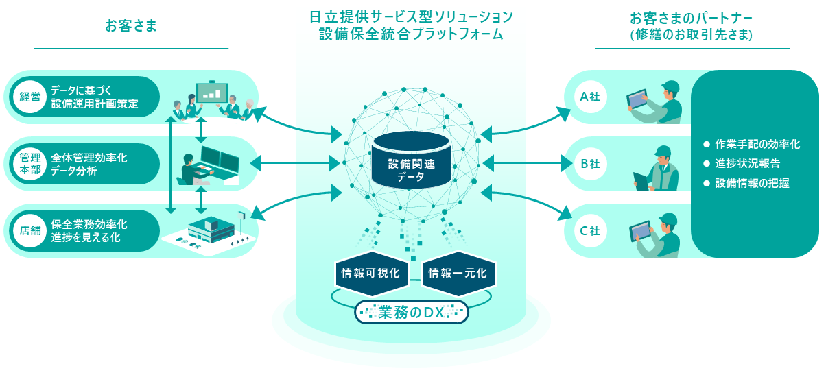 同プラットフォームの下、設備を修繕する取引先、店舗、管理本部、経営層までの関係者が、設備管理や修繕の発注などを共通のシステム上で行うことにより、関係者間での連携の精度とスピードは格段に向上することになります。