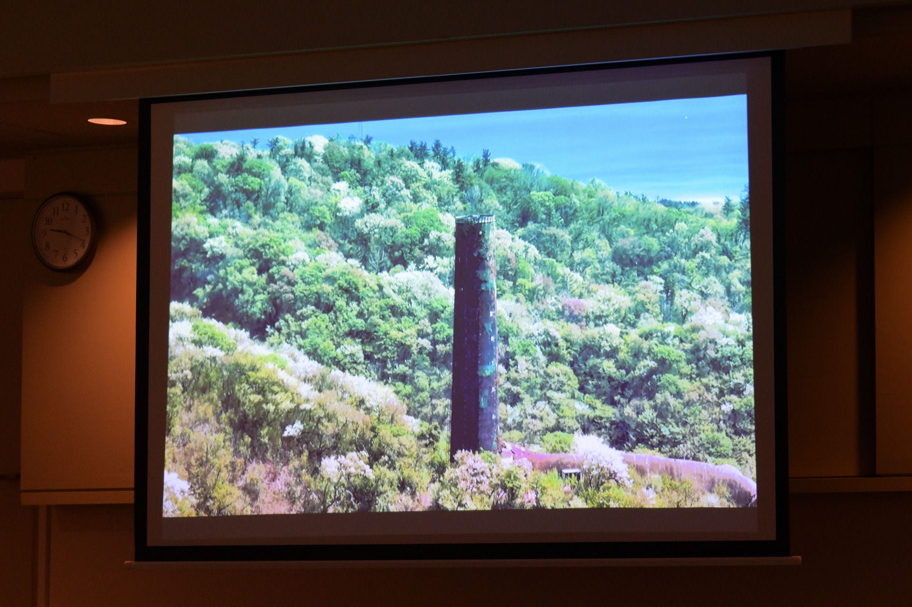 高さが3分の1になった現在の大煙突。「この大煙突には、企業と地域住民との共存共栄の思いが刻み込まれているのですね。経年劣化で倒壊したとき、もし谷側に倒れたら被害が出ていたけれど、うまく山側に倒れて被害がなかったそうです。篠原館長によると、万一のときには山側に倒れるような構造にしてあったのではないか、という説もあるとか。当時の技術者魂を想像すると、ありえない話ではないと思ってしまいますね」(松井氏)