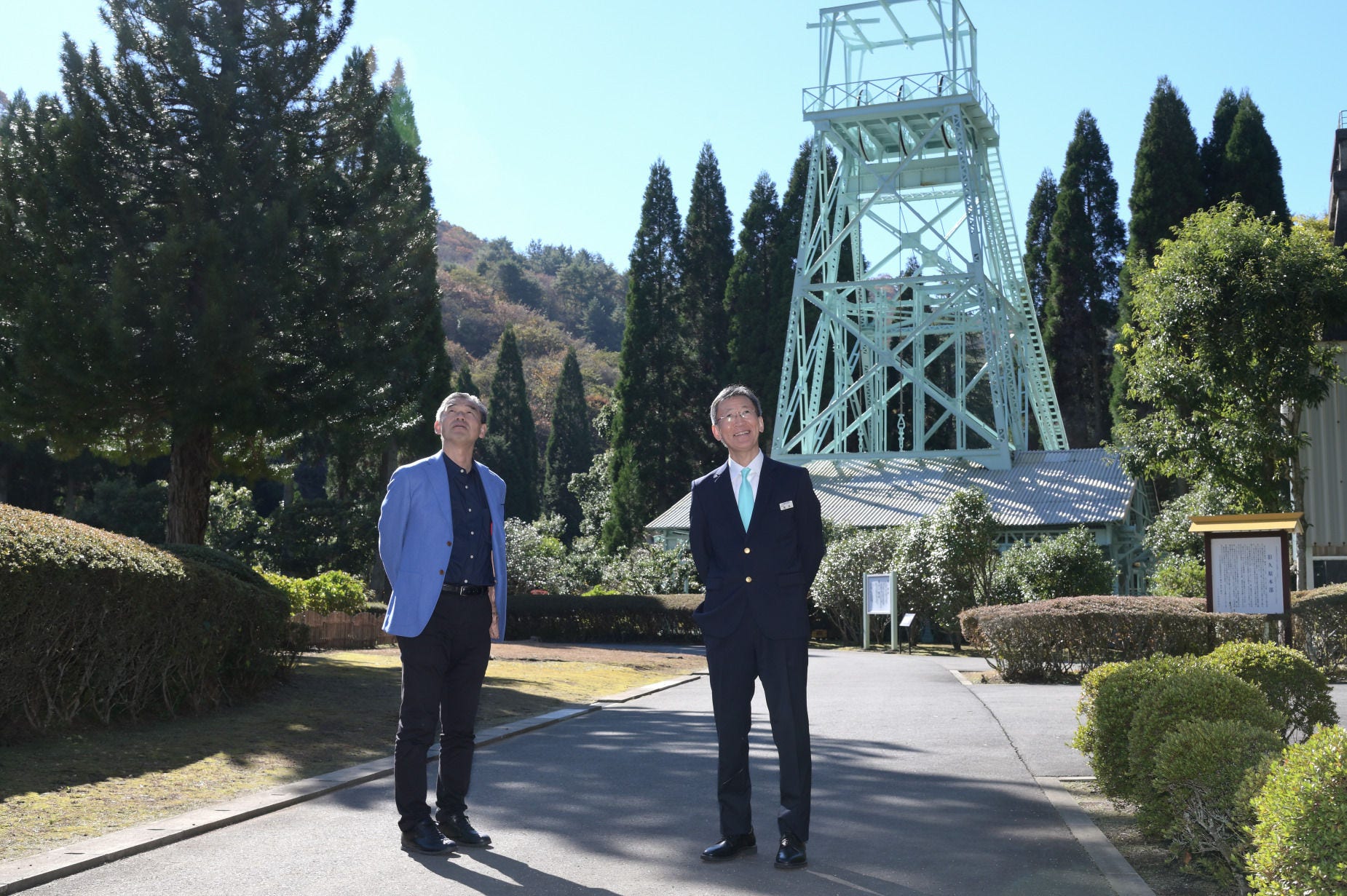 第一竪坑櫓をバックに篠原館長と。竪坑は、従業員や鉱石を運搬するために地面と垂直に掘られた坑道。ケージと呼ばれた金属製のカゴを、巻揚機を使ってワイヤーで昇降させ、エレベーターのように人や物を運搬した。第一竪坑は、日立鉱山開山直後の1906年2月に開削を開始し、1981年の閉山まで75年間にわたって鉱山の大動脈として活躍した
