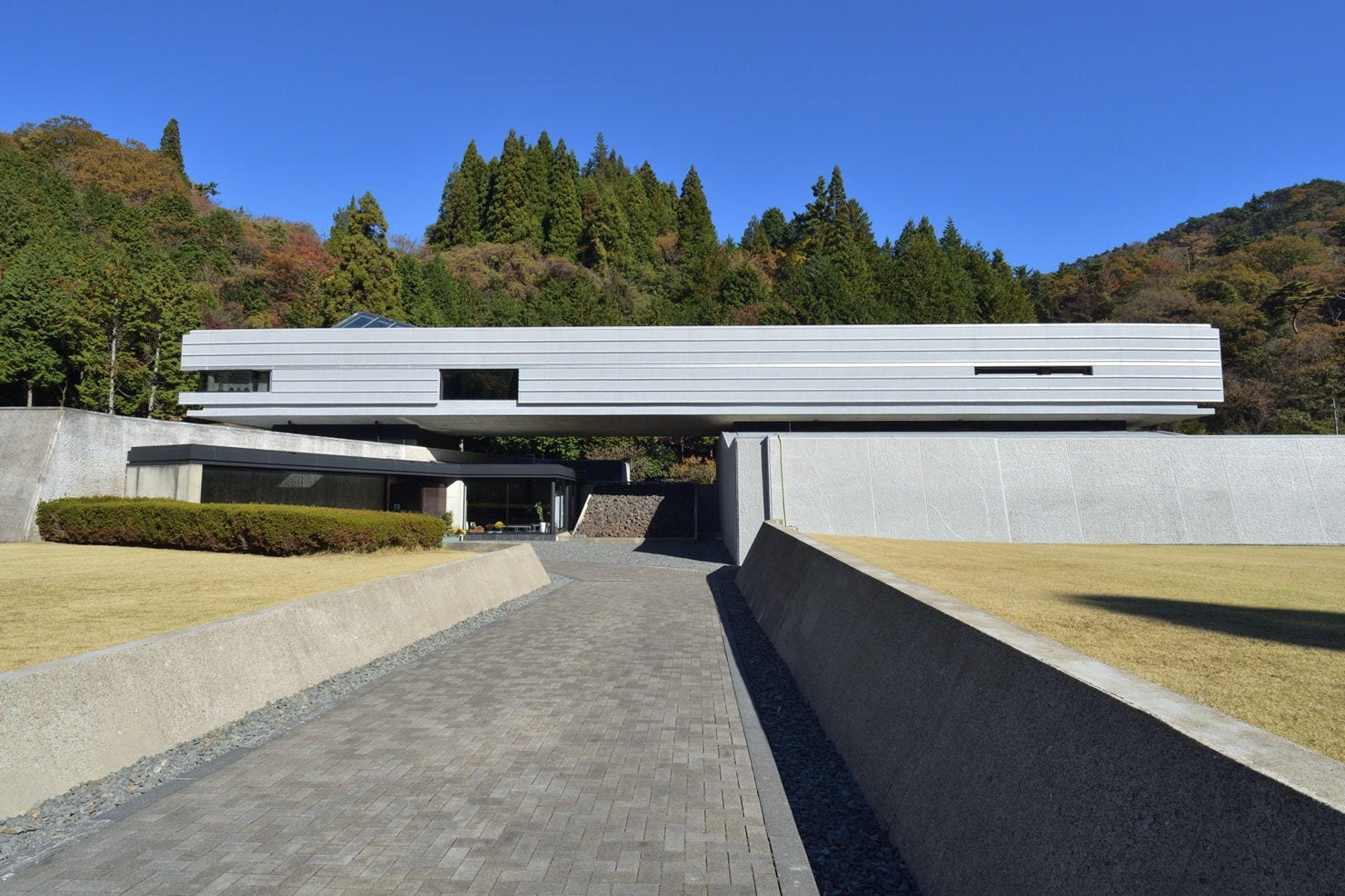 木立を背景に佇むコンクリート造の本館。直線的なラインが重厚かつ洗練された印象だ