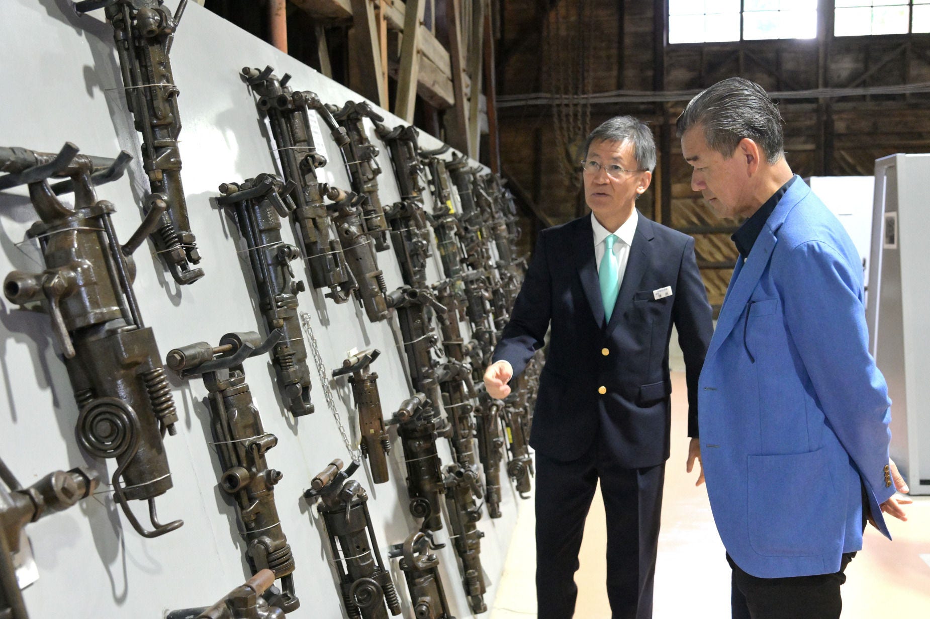 鉱山資料館には、実際に使用されていた削岩機がずらりと並べられている