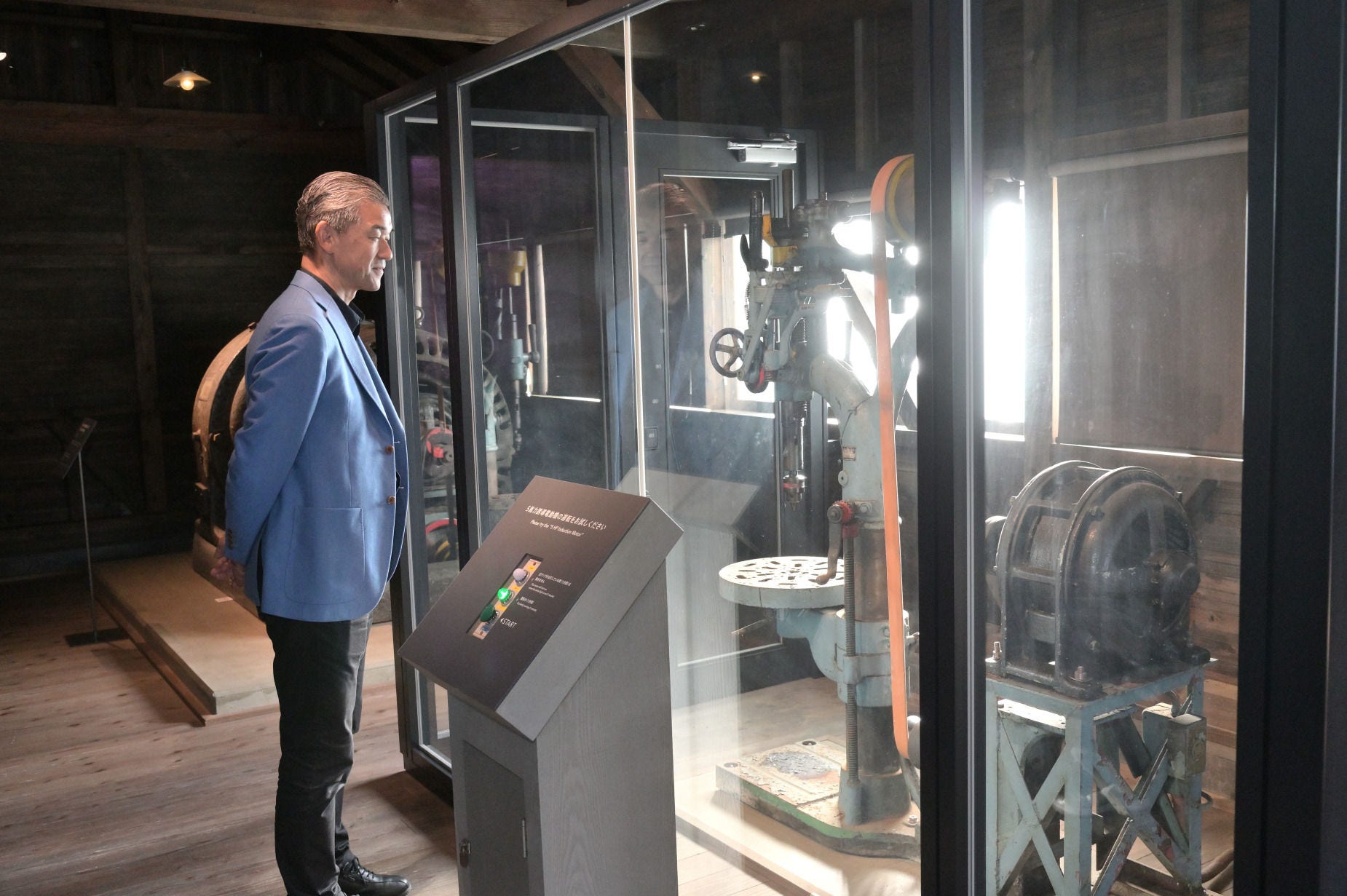 続いて松井氏は、日立の原点である日立鉱山工作課修理工場を再復元した創業小屋へ。創業当時に製造された5馬力誘導電動機は4台が現存、そのうち創業小屋に設置しているものは実際に動く様子が見られる。木造の簡素な小屋の内部には、当時を再現した大きな木のテーブルなども置かれており、創業当時、小平と彼の下に集ったエンジニアたちの息づかいが感じられる。