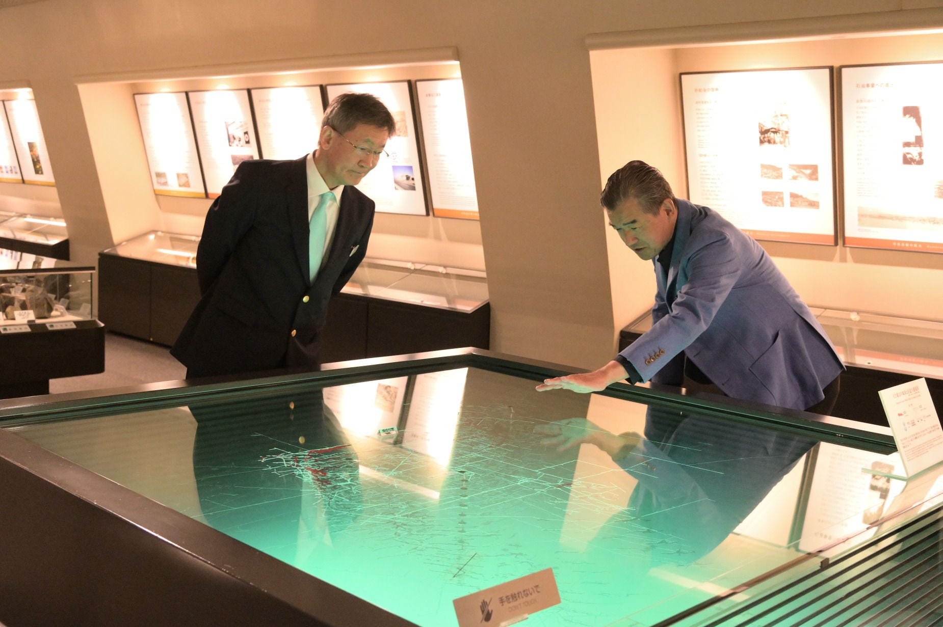 松井氏が注目した展示の一つ「日立鉱山の鉱床と坑道の透視模型」。篠原館長の説明によると、坑道の最深部は記念館の現在地(海抜350メートル)から950メートル地下にまで達したという。坑道の総延長は約700キロメートル。従業員の入出坑、鉱石・資材の運搬に用いるエレベーターが設置されていた縦坑は深さ600メートルあった。ちなみにスカイツリーの高さは634メートル。「地上からまったく見ることができない、まさに宇宙空間に等しい場所に、100年以上前に総延長700キロメートルも掘るというのは現代でも私には想像できません。限られた環境の中でも切削装置や測量技術が当時の世界最高レベルに達していた証しでもあります。それを一目で表せている立体透視模型を見て、良い意味で呆然としました」(松井氏)