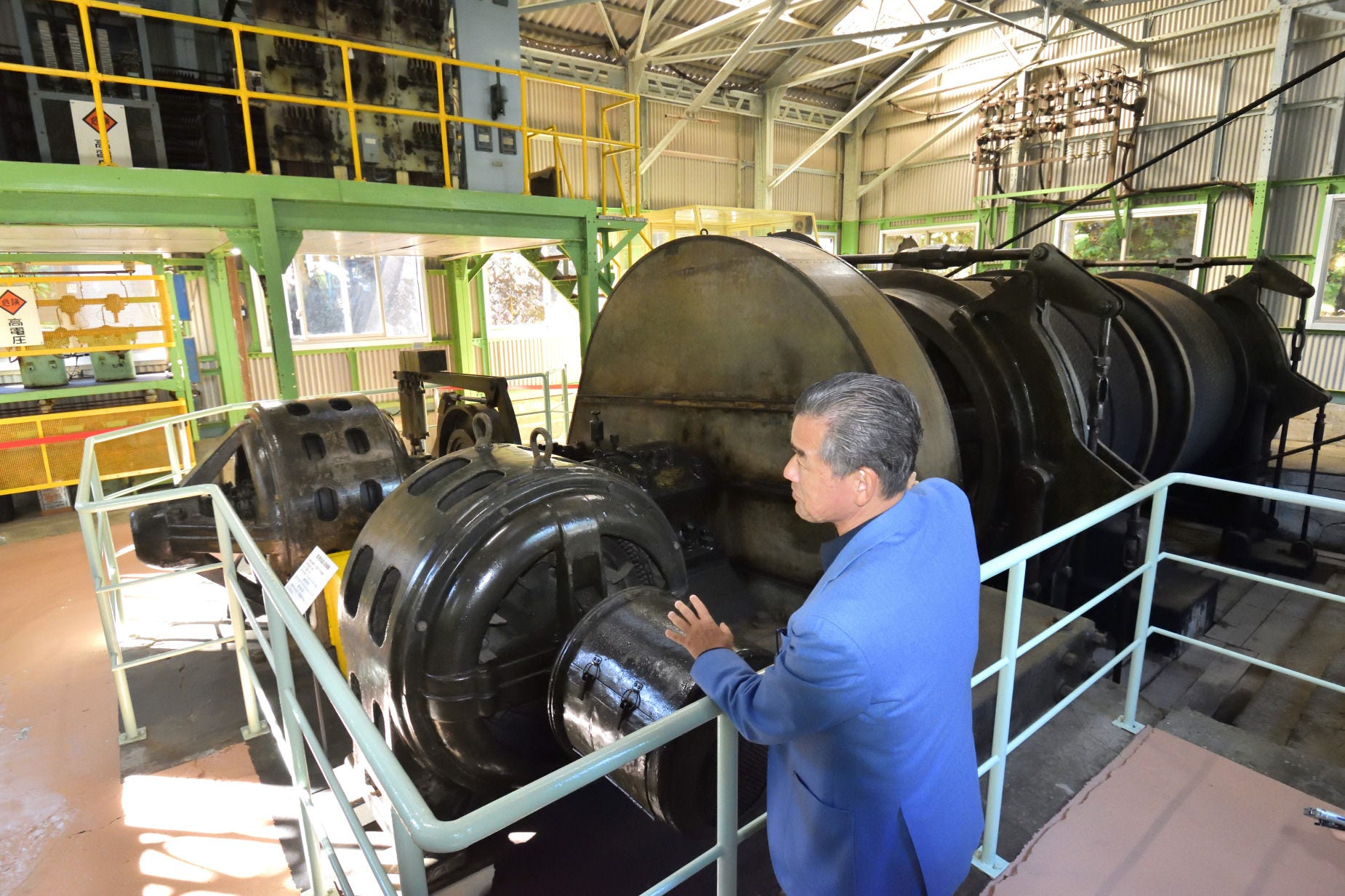 第一竪坑のケージを昇降させていた巻揚機。巨大なモーターでドラムを回転させワイヤーを巻き上げ・下げしていた。当時のまま保存、展示されている