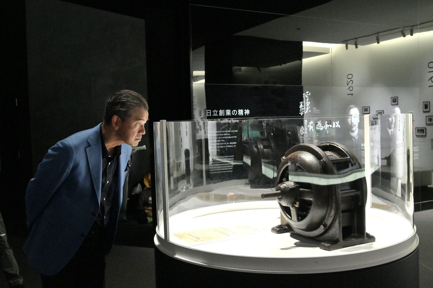 日立最初の製品「5馬力誘導電動機」を見つめる松井氏。「小平さんは学生時代、『模倣をもって満足するだけで日本の工業を論ずることができるだろうか』とノートに書いていたそうですが、たとえ最初は輸入品の模倣でも、技術を自分のものにして、さらにいいものをつくっていくという、日本のものづくりの原型がここにあるのだと感じます」(松井氏)