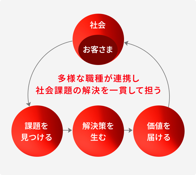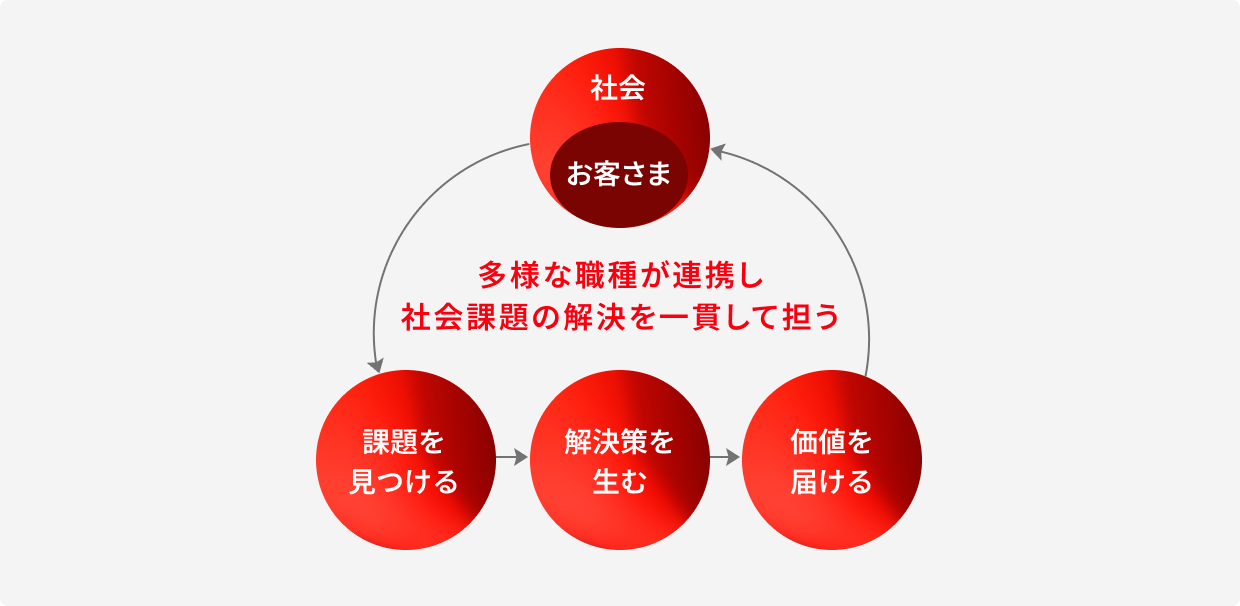 そのため、課題の発見から解決、お客さまや社会への価値提供、それらを横断的に推進する役割まで、非常に多様な職種・業務があります。だからこそ、あなたの志向や経験に合う仕事が必ず見つかり、成長や新たに挑戦できる機会が広がっていきます。