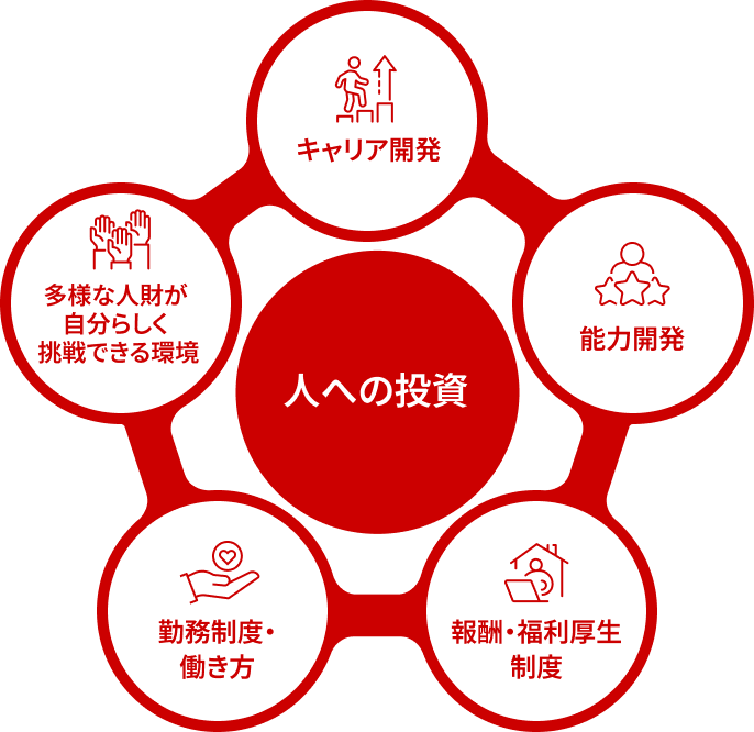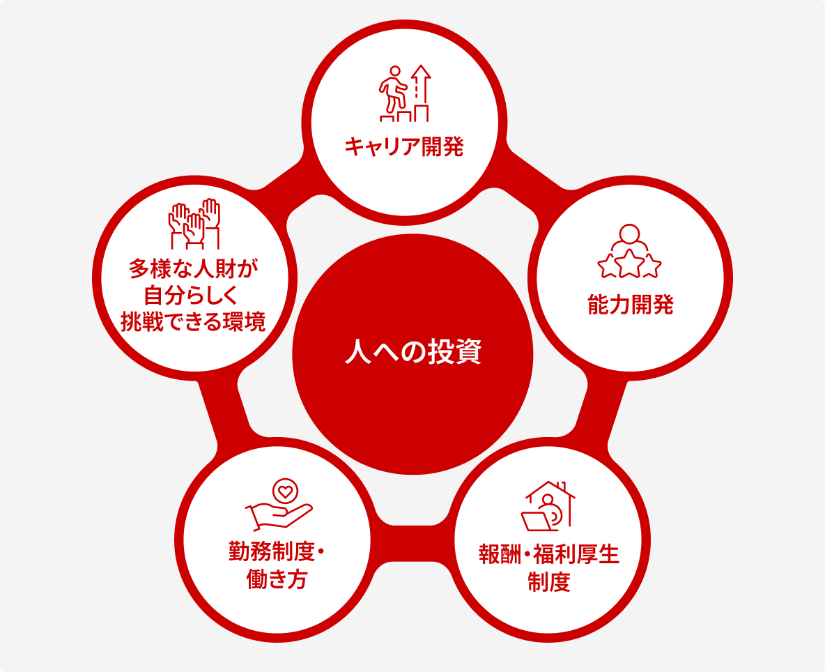 単に制度を整えるだけではなく、多様な人財の挑戦と成長を刺激し、支援するものとして機能するような環境づくりを進めていますので、ぜひ各ページで詳細な内容をご覧ください。