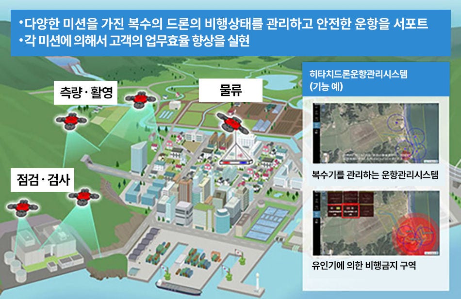 드론 보급을 위해 히타치는 드론과 Lumada를 연계한 기술 개발도 추진하고 있다. 드론으로 수집한 데이터를 IoT 플랫폼으로 분석하는 것이다.