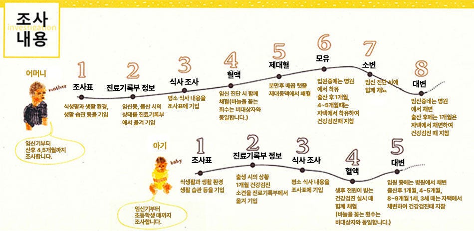 모자 건강조사는 산학관 연계로 시행하는 모자 코호트 연구*입니다. 임산부와 출생아 각각을 대상으로 식사와 생활 습관, 생활 환경 등에 대해 설문조사를 실시하는 동시에 건강진단 시 혈액, 소변, 제대혈, 모유, 대변 등을 채취해 분석합니다. 데이터 분석을 통해 아이들의 성장과 발달에 미치는 영향을 조사하는 것은 물론, 조사를 계기로 건강검진율 향상 및 생활 습관 개선 등 임산부의 행동 변화를 촉구하는 것도 모자 건강조사의 중요한 목적입니다. 식습관 설문조사 결과를 바탕으로 임산부에게 식습관 평가 및 개선사항을 조언해 줍니다. 이를 통해 식습관에 대한 인식을 개선하고 행동 변화를 이끌어 내기를 기대하고 있습니다.