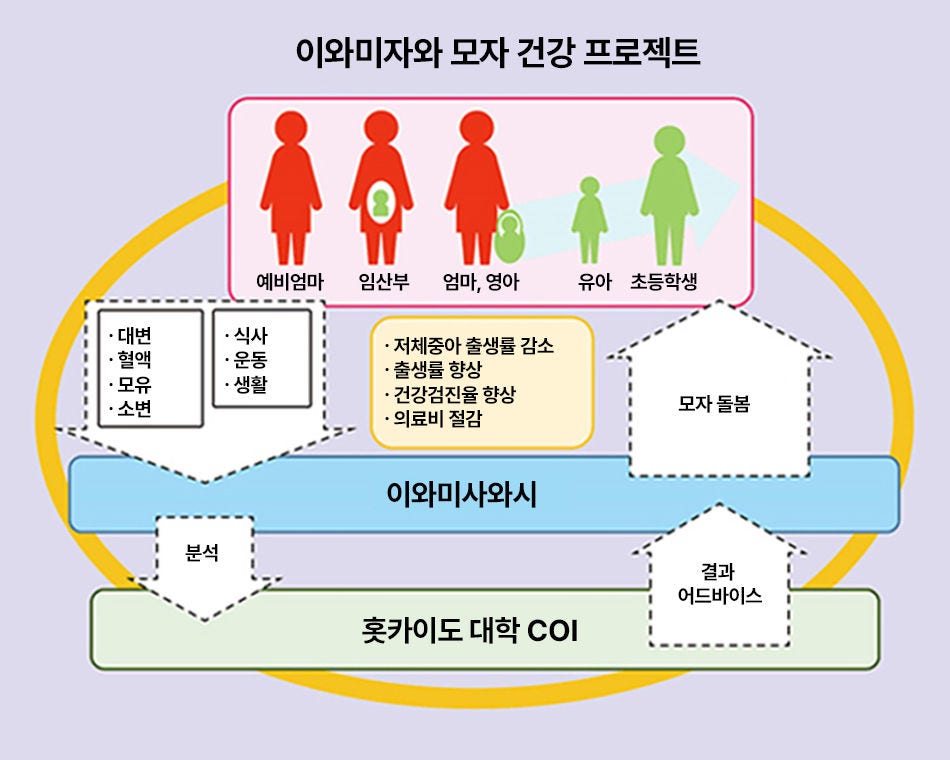 모자 건강조사는 과학기술진흥기구의 센터 오브 이노베이션 프로그램(COI)의 하나로 시행되고 있으며 홋카이도대학 COI에는 홋카이도대학을 중심으로 이와미자와시와 히타치 등 약 40개의 산학관 기관이 참가하고 있습니다. 개개인의 건강 상태에 맞춘 최적의 식사와 운동을 통해 여성과 어린이, 고령자들이 살기 좋은 사회를 실현한다라는 홋카이도대학 COI의 목적과 여성과 육아에 가장 친화적인 마을 만들기라는 이와미자와시의 시책이 적절히 맞아떨어져 함께 추진하게 되었습니다.