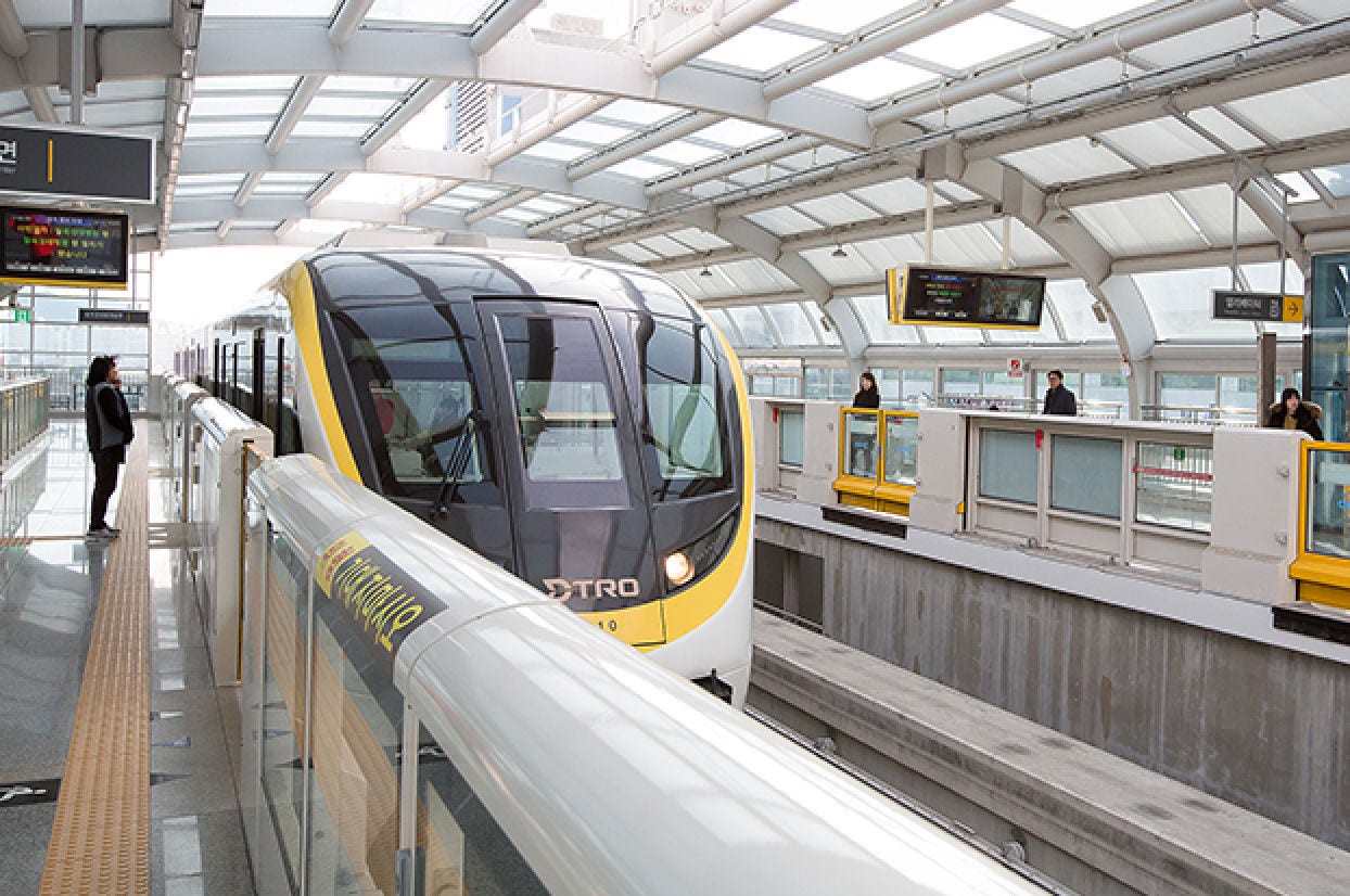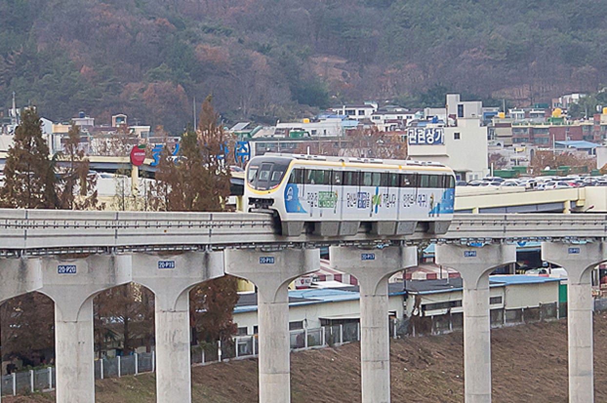 1974년 이후 한국의 대도시가 안고 있는 교통체증 해결에 임해 온 히타치는 2007년에 철도 시스템사업을 담당하는 현지 법인을 설립. 2년 후부터 모노레일 시스템의 납품을 시작했다. 채용된 것은 궤도구조체 위에 걸터앉아서 주행하는 과좌형 모노레일방식으로 차량은 가볍고 내구성이 뛰어나고 리사이클도 가능한 알루미늄 합금을 사용. 도시경관을 해치지 않는 환경친화적 모노레일이 2015년 4월에 개통됐다.