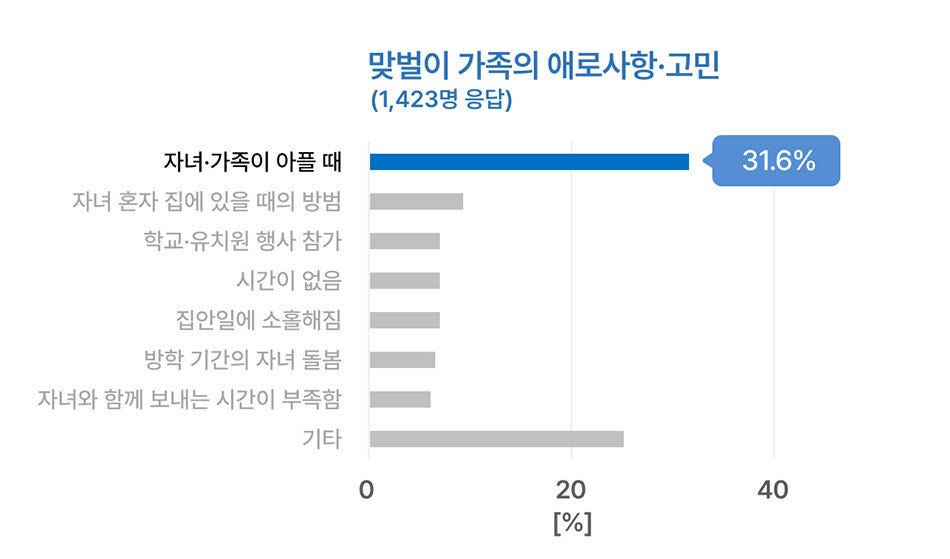맞벌이 가족에게 있어 가장 큰 애로사항은 ‘자녀나 가족의 질병‘ (자료: 주식회사 주환경연구소 ‘맞벌이 가족의 생활과 의식에 관한 조사‘ 2014년)