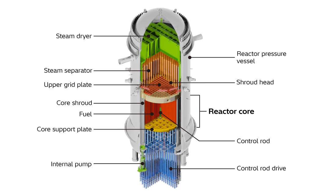 The shroud is a cylindrical structure that surrounds the fuel assemblies within the core. It holds the fuel assemblies and plays a role in creating the channels for cooling water to flow inside the core. The shroud head is a dome-shaped metal plate, positioned at the top of the shroud, and integrated with the steam separator.