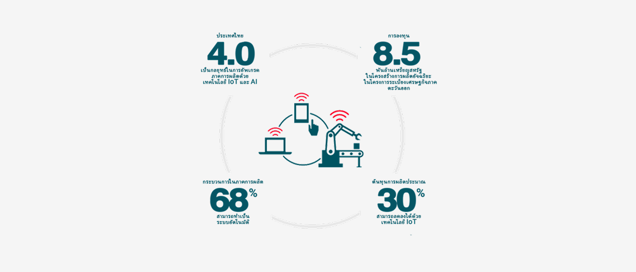 เทคโนโลยีอัจฉริยะ หรือที่รู้จักกันในชื่อ ไอโอที (อินเทอร์เน็ตของสรรพสิ่ง – IoT: Internet of Things) และรัฐบาลไทยได้ปล่อยเทคโนโลยีดังกล่าวให้กับภาคอุตสาหกรรม ซึ่งคิดเป็นเงินถึง 27% ของ GDP แม้ว่าภาคอุตสาหกรรมนี้จะประสบความสำเร็จ แต่ผู้เชี่ยวชาญกลับเชื่อว่าประเทศไทยกำลังติดกับดักรายได้ปานกลาง ที่มีการเติบโตต่ำ และมีช่วงรายได้ต่อหัวปานกลาง
