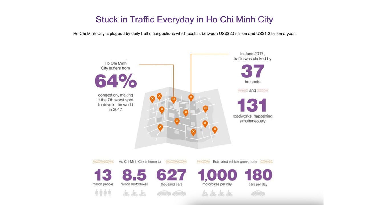 TP. Hồ Chí Minh đang đối mặt với tình trạng ùn tắc giao thông nghiêm trọng hàng ngày, khiến thành phố này tiêu tốn từ 820 triệu đến 1,2 tỷ USD mỗi năm. Vấn đề này có liên quan rất lớn đến ô nhiễm không khí và lượng khí thải carbon. Chính quyền thành phố đã xem xét nhiều giải pháp khác nhau như làm đường trên cao, đổi đường lớn thành đường một chiều và thậm chí cấm phương tiện giao thông cá nhân trong các khu vực trung tâm thành phố.