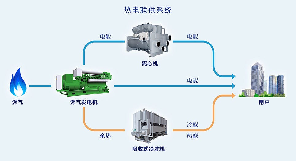 在日立热电联产系统中,燃气发电机在发电的同时中产生的余热被导入日立溴冷机热能转化为冷能,借此可以实现供冷、热、电多种能源梯级转化和供给。通过日立的热电联产系统可将综合能源转化效率提高至80%甚至90%以上。实现国家推广的能源梯级利用,真正实现了节能。