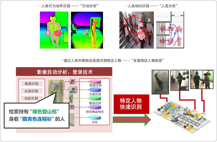 广泛的物理防御技术诸如出入室管理、安防监控摄像机、车辆识别、影像综合管理等众多技术,可利用数据实现更高等级的解析,具有发现异常行为,不仅可以通过人脸识别,也可通过人物的形态特征,追踪危险人物等功能。不仅可用于安全异常检测,在品质管理、操作效率等方面也能发挥用处。