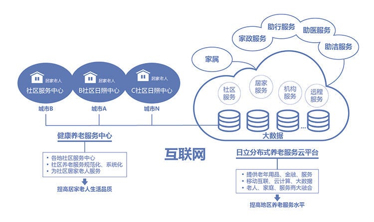 日立的互联网+智慧社区居家养老服务解决方案借助基于互联网的大数据处理和信息技术的优势,依据社区居家养老服务的需求和老年群体日常生活及活动等特点,采用智慧化的技术手段构筑一个以辖区老年群体为核心、社区照料中心为基点、智能设备为辅助手段、多样化为老服务为内容的智慧社区居家养老服务信息平台,为社区居家老人提供方便、快捷、贴心的为老服务。